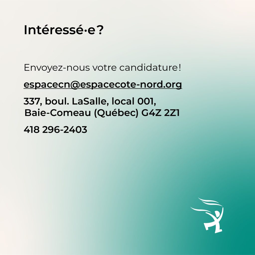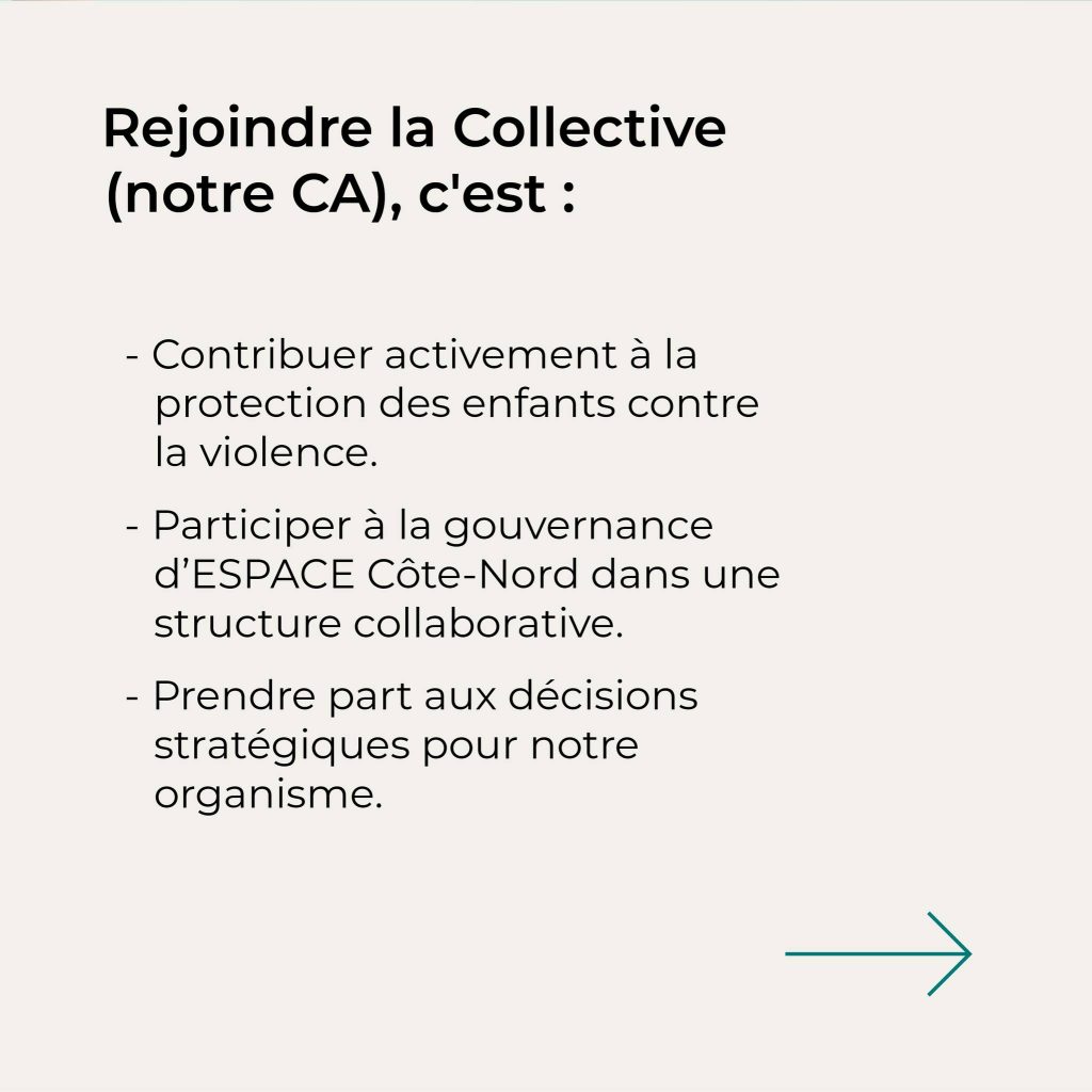 Depuis plus de 20 ans, ESPACE Côte-Nord (ECN) outille les enfants, les parents et les milieux pour prévenir toutes les formes de violence faites aux enfants.Aujourd’hui, nous avons 2 postes disponibles au sein de notre conseil d’administration!